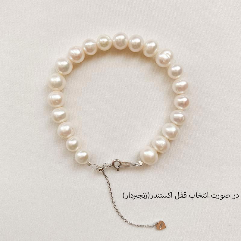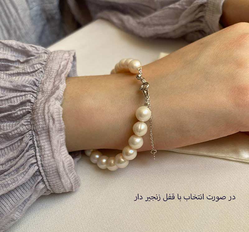 دستبند مروارید اصل (پرورشی) رنگ سفید سایز حدوداْ ۸-۹ میلیمتر به طول ۱۸ سانتی متر استاندارد(با درنظر گرفتن قفل نقره) که میتوانید طول گردنبند را تا ۲۰ سانتی متر هنگام خرید افزایش دهید. جنس قفل به کار رفته در این دستبند مرواریدی نقره با عیار ۹۲۵ وارداتی با آبکاری درجه یک است. این مدل قفل ها از دو قطعه تشکیل شده اند که با نگه داشتن اهرم داخلی به سمت پایین قفل باز خواهد شد. اگر این قطعه را دوباره به سمت داخل فشار دهید و همزمان اهرم را پایین نگه دارید مجددآ قفل بسته خواهد شد. این قفل بسیار ایمن بوده و براحتی باز نمیشود. مروارید های این دستبند نیز با انتخاب کیفیت بسیار بالا برای شما انتخاب و طراحی شده است. مروارید ها به دلیل طبیعی بودن یک شکل و حتی کاملا یک اندازه نیستند و سایز آنها حدودا ۸ تا ۹ میلیمتر میباشد.