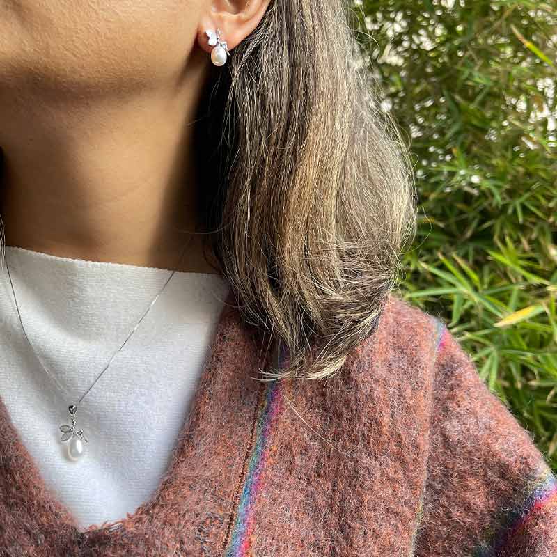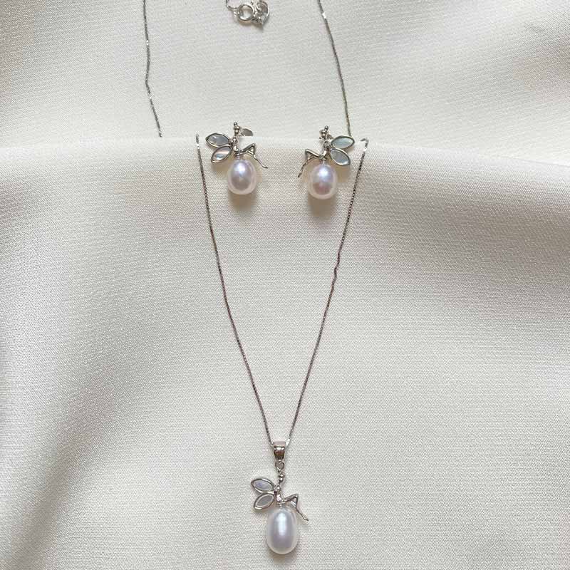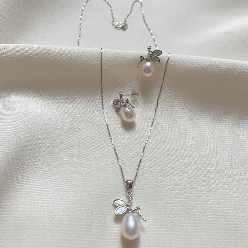 ست مروارید پرورشی سفید Drop Pearl با سایز ۸ میلیمتر و کیفیت AAA، ترکیبی از ظرافت کلاسیک و طراحی الهامگرفته از مفاهیم لطیف و معنوی است. مرواریدهای قطرهای بهکاررفته در این ست از نوع مروارید پرورشی بوده و دارای سطحی صاف، درخشندگی بالا و رنگ سفید شفاف هستند که نشاندهنده کیفیت ممتاز آنهاست.
