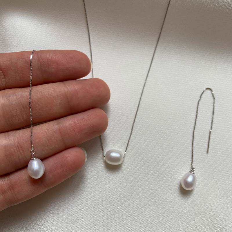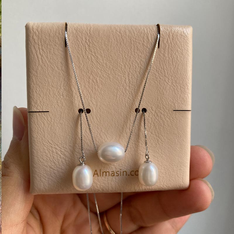 این ست شیک و ماندگار شامل گردنبند مروارید پرورشی سفید مدل Drop به طول ۴۵ سانتی متر بههمراه گوشواره نقره از مدل بخیه ای و آویز بوده که انتخابی ایدهآل برای استایلهای کلاسیک و مجلسی است. مرواریدهای استفادهشده دارای کیفیت AAA هستند که نشاندهنده سطح صاف، درخشندگی بالا و رنگ سفید طبیعی آنهاست.