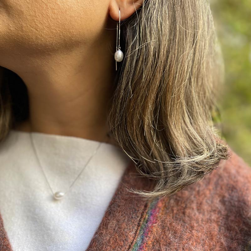 سایز مروارید گردنبند ۸ تا ۹ میلیمتر بوده و با فرم قطرهای (Drop)، جلوهای ظریف اما چشمگیر به گردن میبخشد. گوشوارههای همراه این ست از نقره اصل ساخته شدهاند و بهخوبی با گردنبند هماهنگ شدهاند تا ظاهری یکدست و لوکس ایجاد کنند.