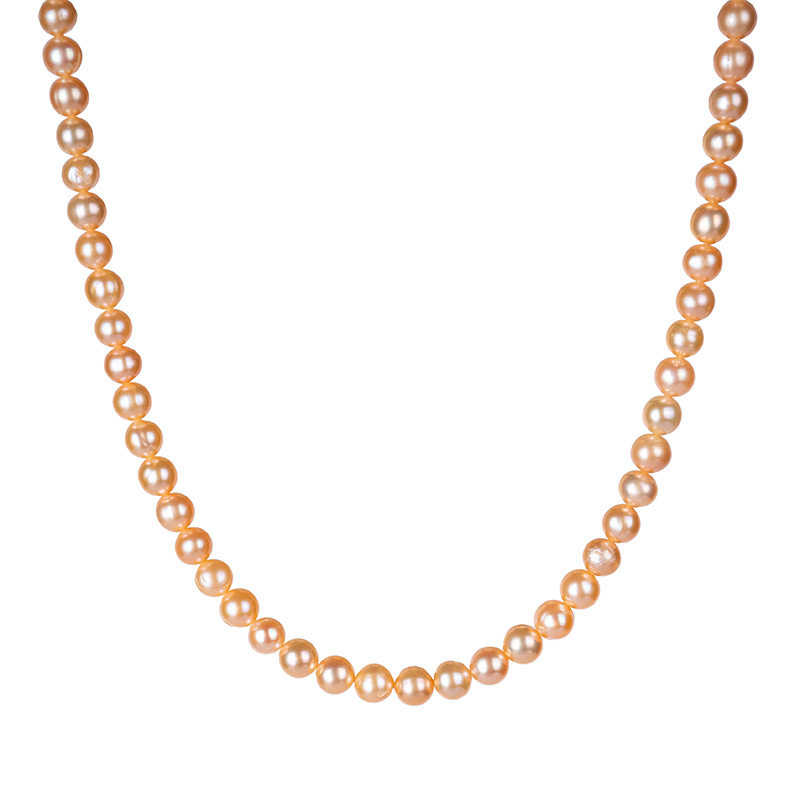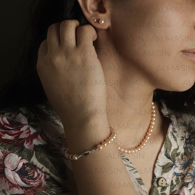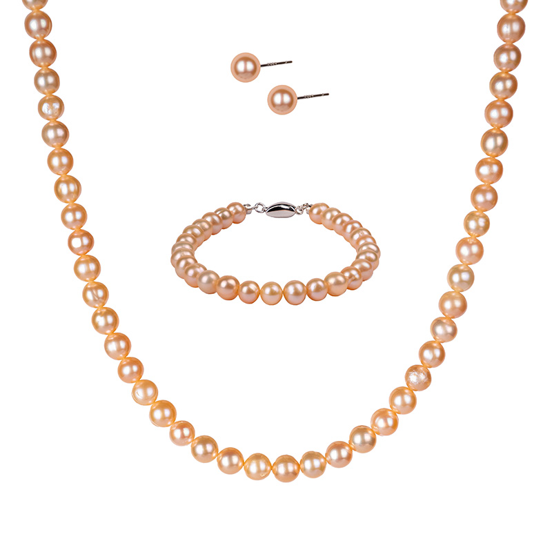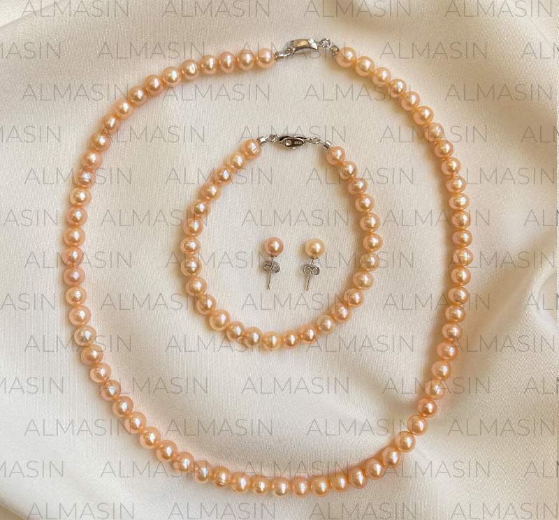 سرویس مروارید پرورشی گلبهی(رزگلد) سایز ۶ میلیمتر شامل گردنبند، دستبند و گوشواره مروارید گرد میخی