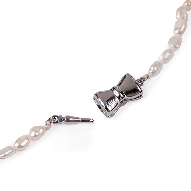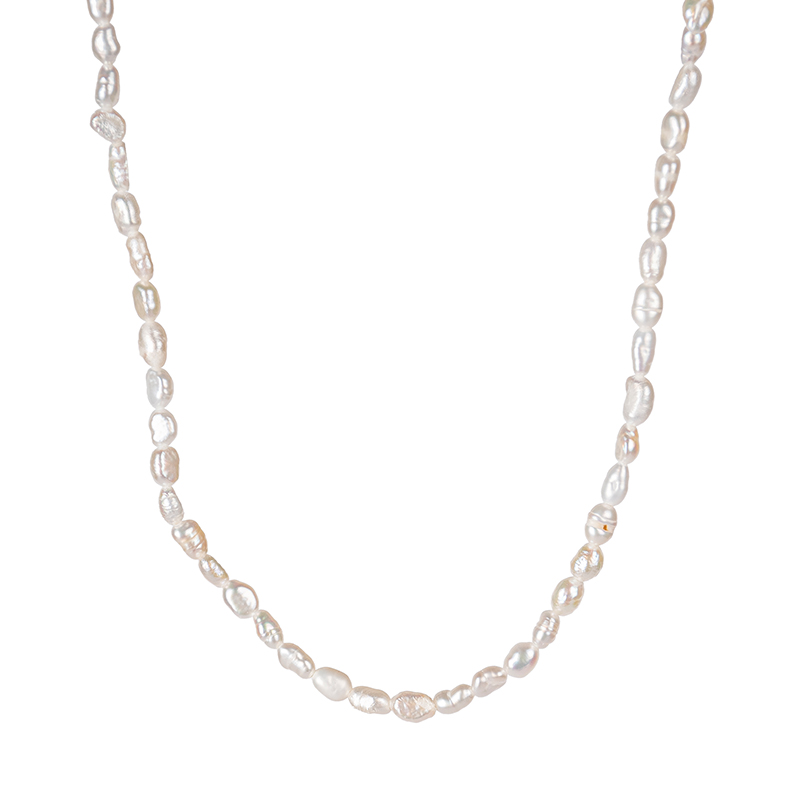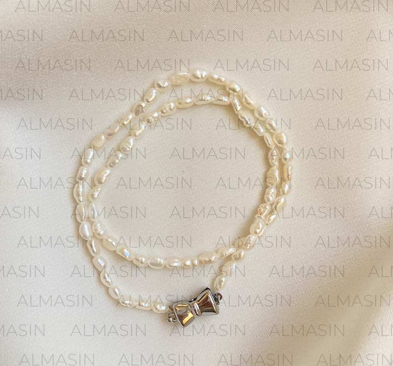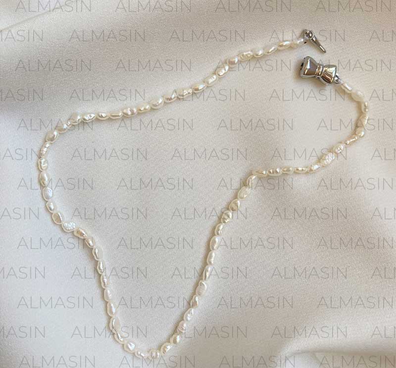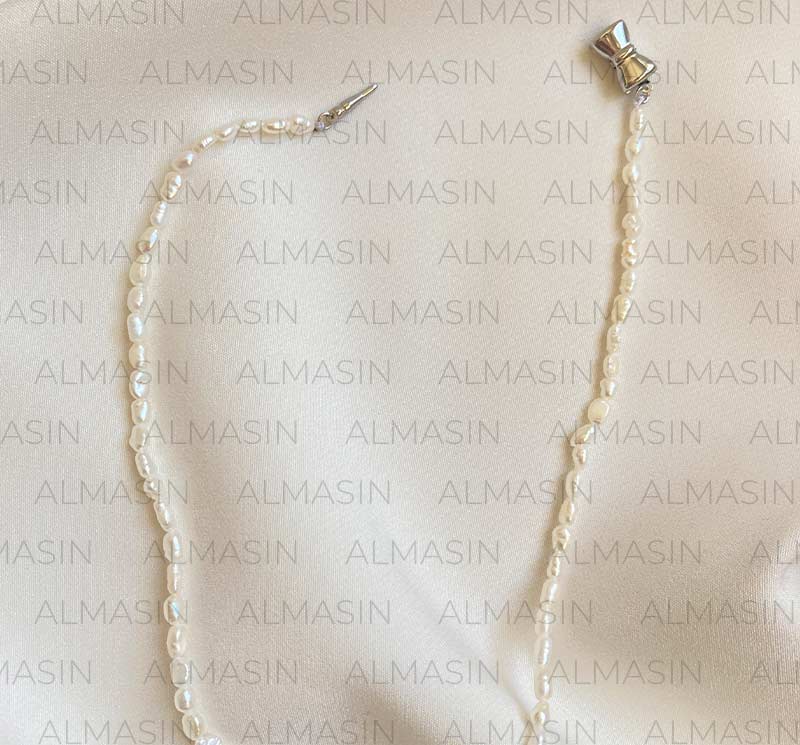 گردنبند مروارید باروک سفید پرورشی به طول حدود ۳۷ سانتی متر(چوکر) با قفل استیل. امکان تغییر قفل به زنجیر دار نقره برای تغییر سایز وجود دارد.