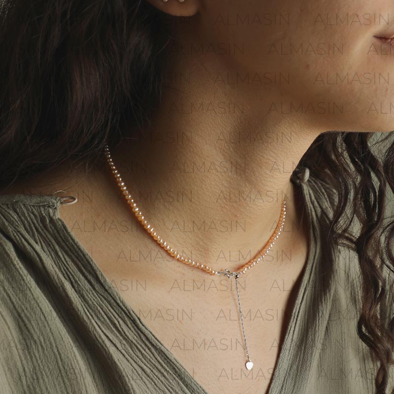این گردنبند از مرواریدهای اصل پرورشی با کیفیت و قطر ۲.۵ تا ۳ میلیمتر تهیه شده است که به سبب رنگ رزگلد (گلبهی) خود، جلوهای ظریف و شیک به همراه دارد. طول این گردنبند ۴۰ سانتیمتر بوده و با قفل اکستندر نقره وارداتی از برند الماسین مجهز شده است، که امکان تنظیم طول و سهولت استفاده تا ۵ سانتی متر بیشتر را فراهم میسازد.