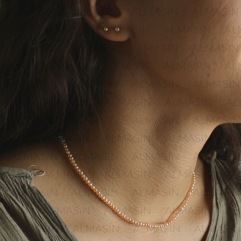 گردنبند مروارید اصل پرورشی 3-2.5 میلیمتر رنگ رزگلد(گلبهی) به طول ۴۰ سانتی متر با قفل اکستندر نقره وارداتی برند الماسین.